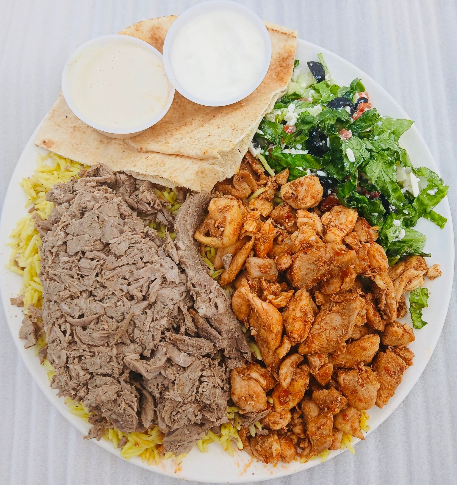 Shredded beef and chopped chicken with a special seasonal over basmati rice with a choice of salad & a choice of sauce, one slice of pita bread, authentic and diverse flavors for all taste buds.